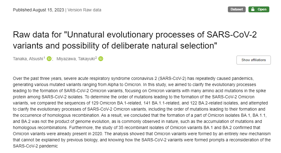 “Over the past three years, severe acute respiratory syndrome coronavirus 2 (SARS-CoV-2) has repeatedly caused pandemics, generating various mutated variants ranging from Alpha to Omicron. In this study, we aimed to clarify the evolutionary processes leading to the formation of SARS-CoV-2 Omicron variants, focusing on Omicron variants with many amino acid mutations in the spike protein among SARS-CoV-2 isolates… As a result, we concluded that the formation of a part of Omicron isolates BA.1, BA.1.1, and BA.2 was not the product of genome evolution, as is commonly observed in nature, such as the accumulation of mutations and homologous recombinations. Furthermore, the study of 35 recombinant isolates of Omicron variants BA.1 and BA.2 confirmed that Omicron variants were already present in 2020. The analysis showed that Omicron variants were formed by an entirely new mechanism that cannot be explained by previous biology, and knowing how the SARS-CoV-2 variants were formed prompts a reconsideration of the SARS-CoV-2 pandemic.”